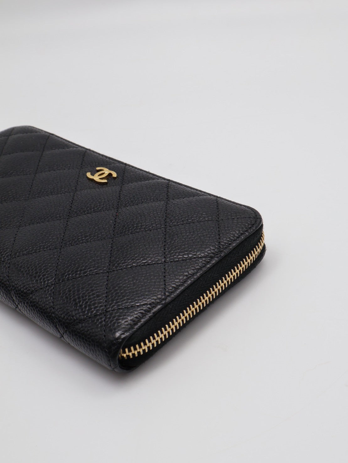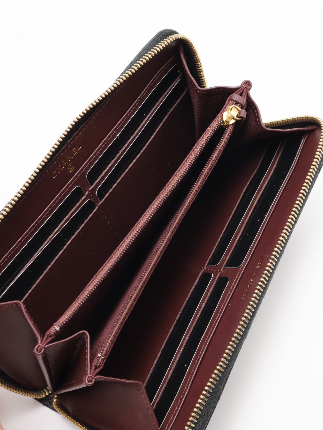 CHANEL 經典粒面牛皮拉鍊長夾 - 黑金22開