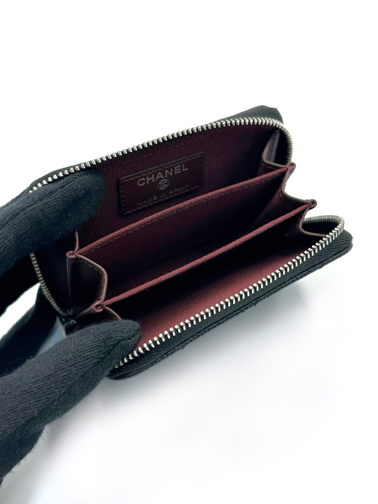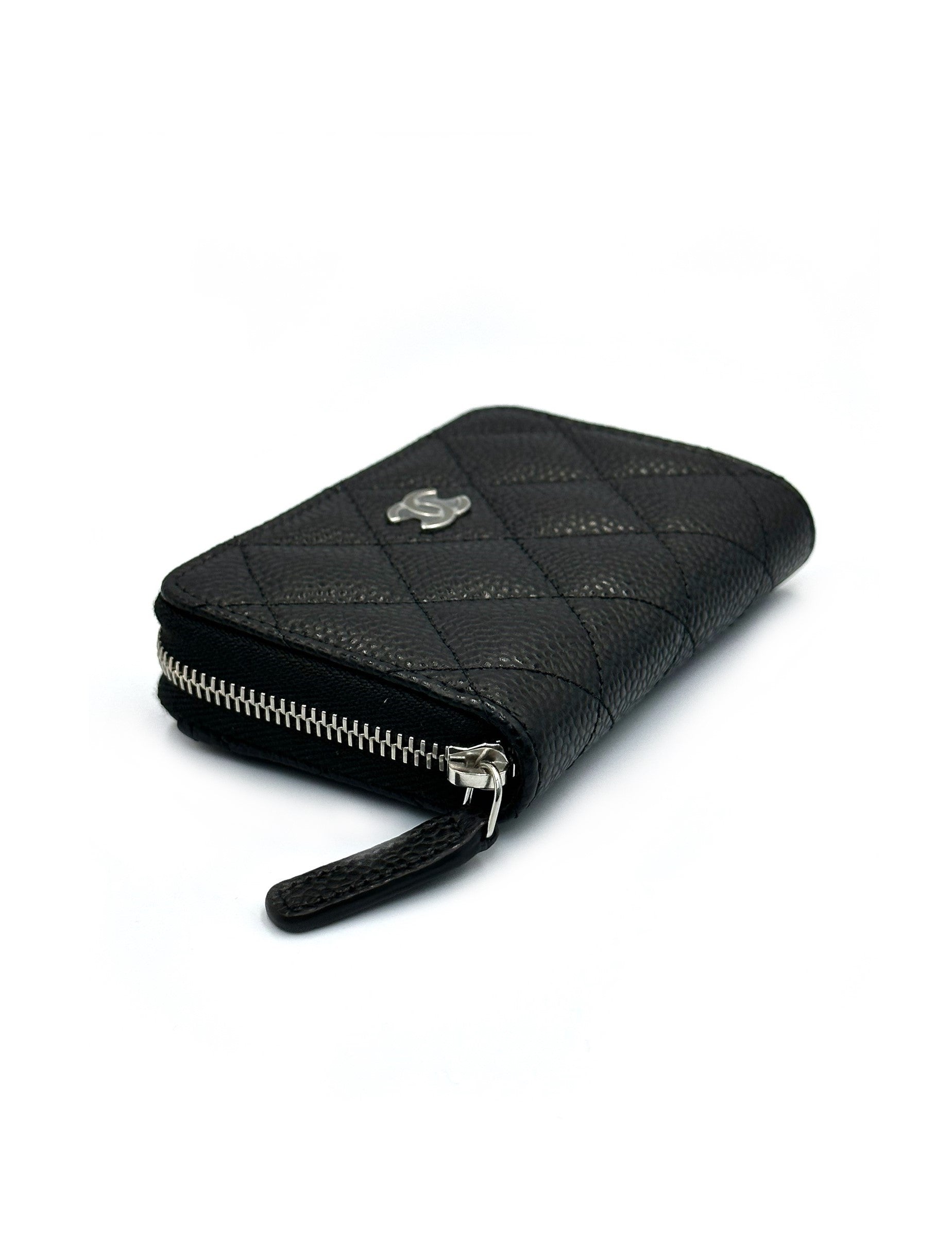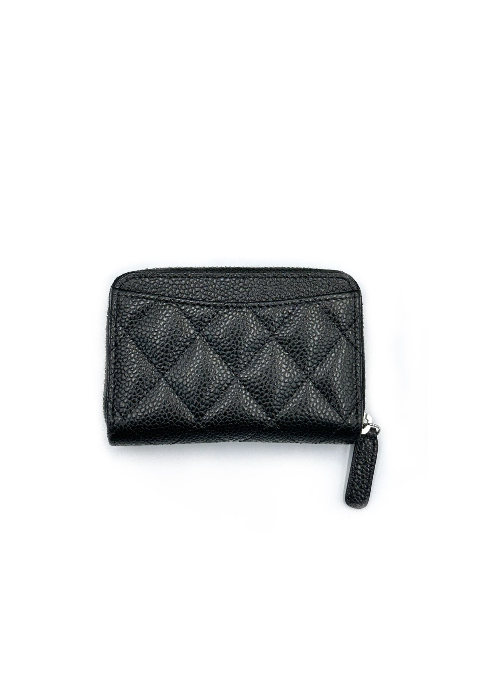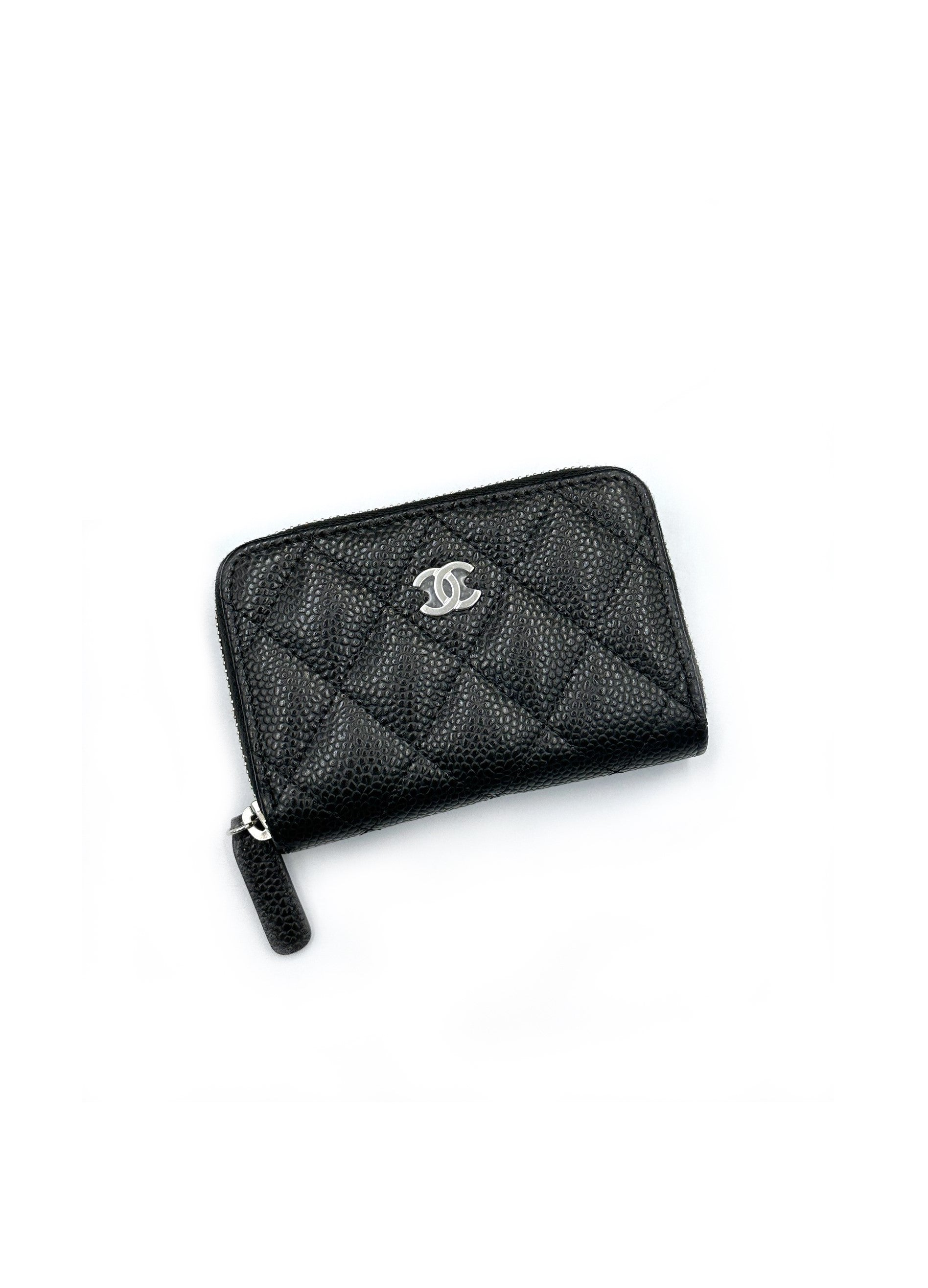 CHANEL 經典荔枝皮拉鍊零錢包 - 黑銀